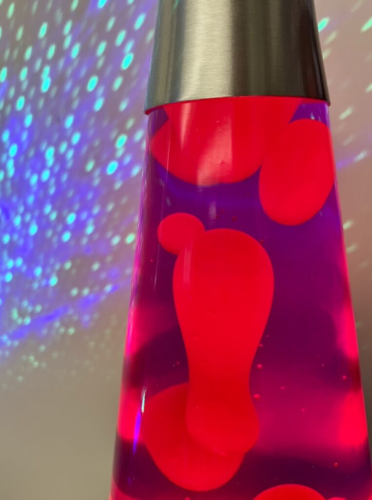 We recently got our hands on a striking purple and red lava lamp with a nice silver base, and it’s now a statement piece on my husband’s desk at work. His students are in complete awe of it. He uses another light to cast an awesome glow on the wall behind the lava lamp, making it look even more trippy! Plug the lamp in, It will take a couple of hours for the lamp to warm up and get moving. I recommend turning off the lamp when you’re not using it and do not leave it on over night. Also, just a little heads-up: the base can get hot due to how the lamp operates, so be cautious.
