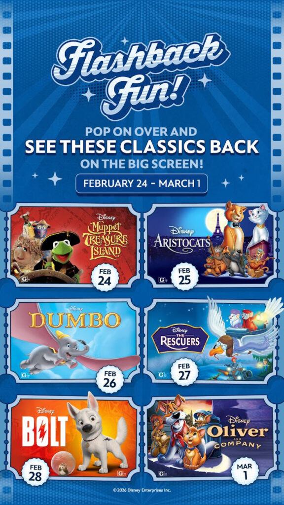 Daily showtimes for “Muppet Treasure Island” on February 24 are 1:00pm, 4:00pm, and 7:00pm, and tickets are $5 as part of our Big Screen Big Deal $5 Tuesday! Daily showtimes for “The Aristocats” on February 25, “Dumbo” on February 26 and “The Rescuers” on February 27 are 1:00pm, 4:00pm, and 7:00pm. Daily showtimes for “Bolt” on February 28 are 10:00am and 7:00pm. Daily showtimes for “Oliver and Company” on March 1 are 10:00am, 1:00pm, 4:00pm, and 7:00pm.